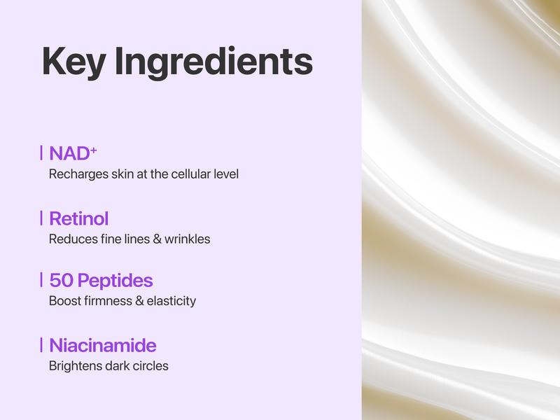 Formulated with 1,000ppm of 100% pure salmon PDRN to restore a natural glow and even skin tone by strengthening the skin barrier and supporting overall skin health. Powered by NAD+, an anti-aging ingredient that boosts cell turnover, stimulates collagen production, and supports repair, along with 50 peptides to visibly firm and plump the skin. *The formula’s soft violet hue comes from Vitamin B12, while its natural pearlescence is derived from ceramides.